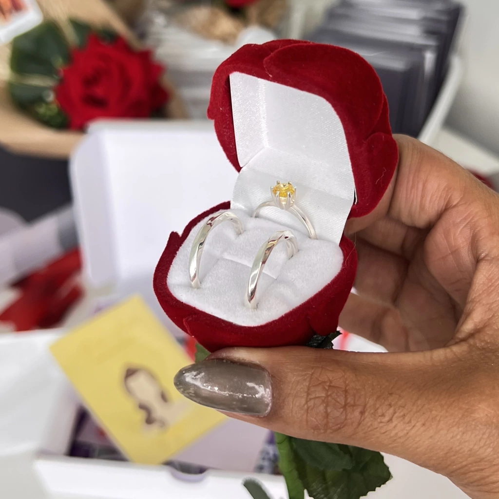 Par de alianças, anel solitário, gravacoes internas, caixinha de veludo Classica, flanela de limpeza, Petalas vermelhas, itens tematicos e etc-
