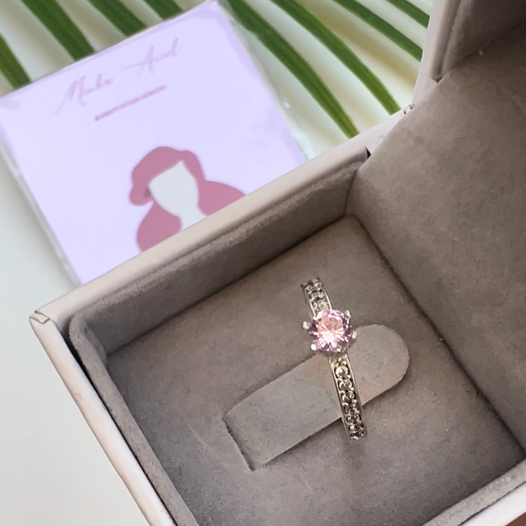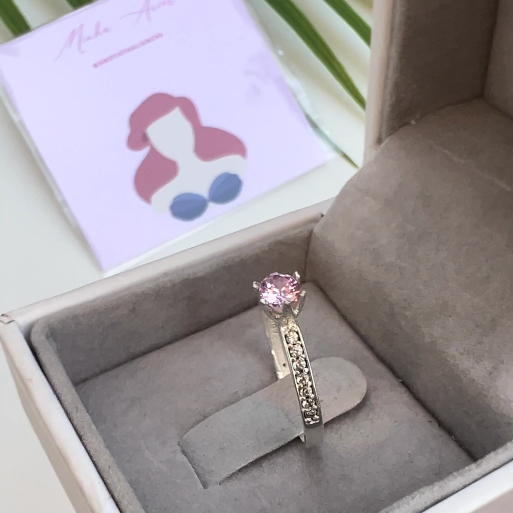 Anel ARIEL é feito em PRATA 925, possui pedras laterias brancas + pedra central rosa claro em zircônia!!